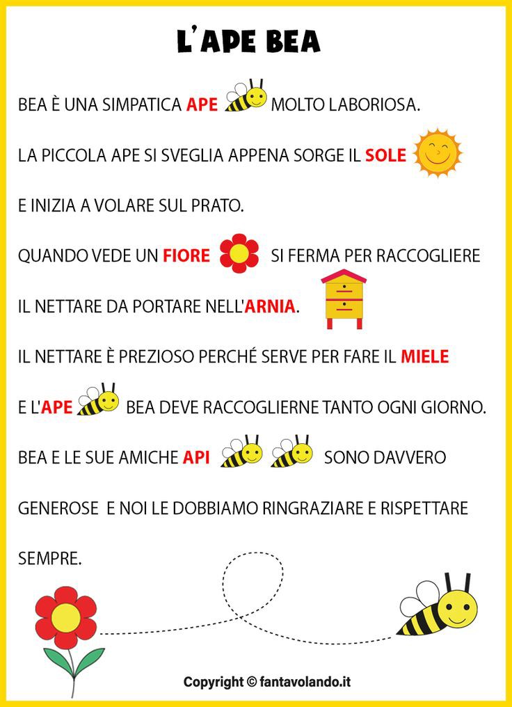 L'insegnante fa sedere i bambini in circle time e legge il racconto "l'Ape Bea". Spiega ai bambini il significato delle parole che non conoscono e li invita ad osservare le parole nella scheda scritte in rosso: APE- SOLE - FIORE - ARNIA - MIELE - APE - API e a "leggere" le immagini del racconto. Successivamente l'insegnante consegna le schede ai bambini per completarle e colorarle. Una volta completate, come attività di verfica, i bambini procederanno a riordinare la storia secondo le sequenze temporali.