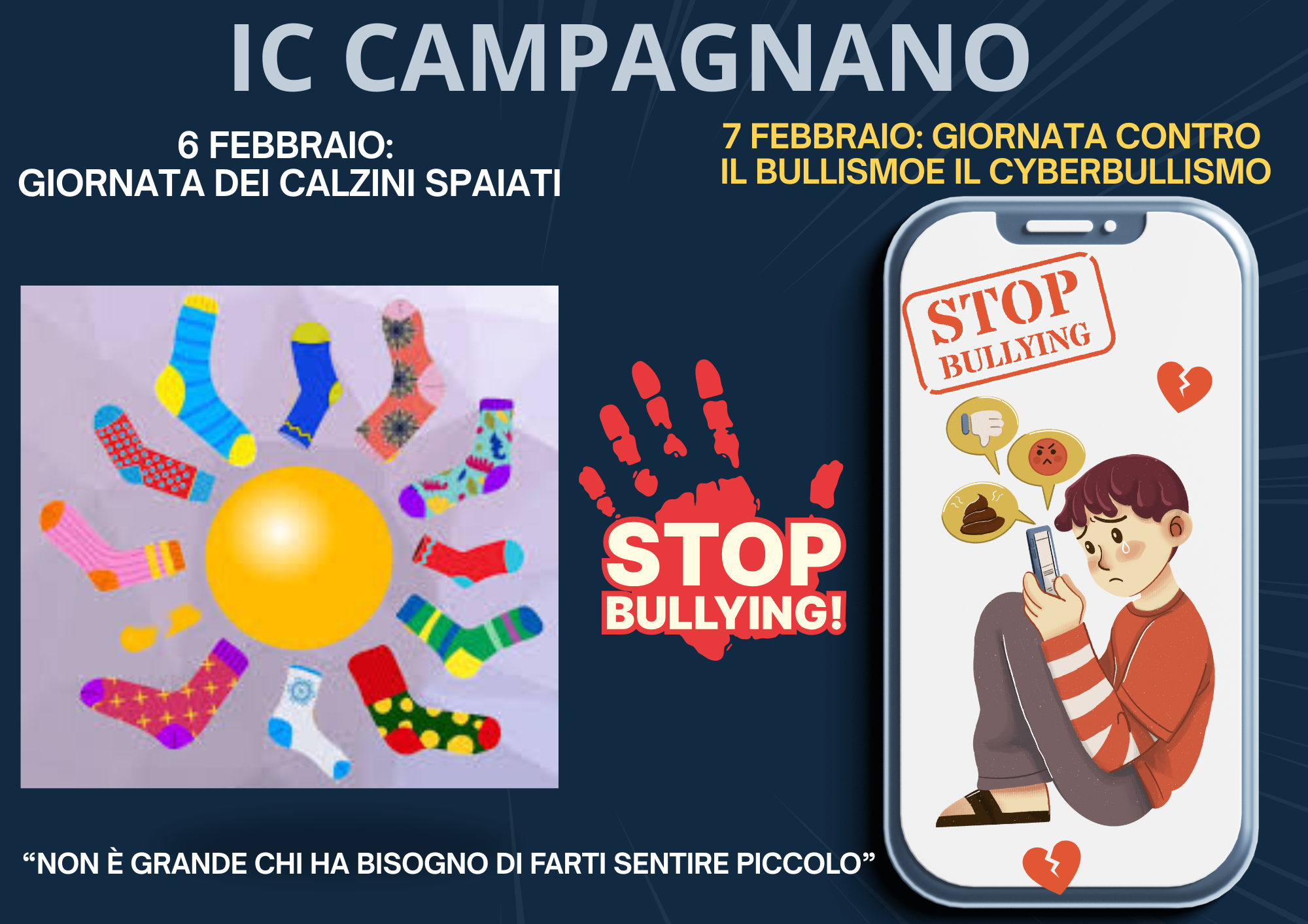Il 6 e il 7 febbraio rappresentano due appuntamenti di grande valore educativo e formativo per la nostra scuola: la Giornata dei calzini spaiati e la Giornata internazionale contro il Bullismo e il Cyberbullismo. Due momenti diversi ma profondamente collegati, che invitano a riflettere sul rispetto dell’altro, sull’accoglienza e la valorizzazione delle differenze e sulla costruzione di relazioni positive, empatiche e inclusive.